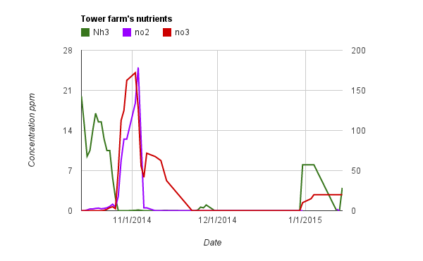 During the start up of the system, the pH decreased once nitrification was efficient, but the pH increased after that, since there was no source of additional ammonia. I therefore started to add some ammonia, which keeps the pH around 7 as it is alkaline. A few weeks ago I increase the amount of ammonia I add so in the last week, I didn't add any as ammonia was building up in the water. In consequence, the pH has dropped a bit.